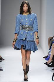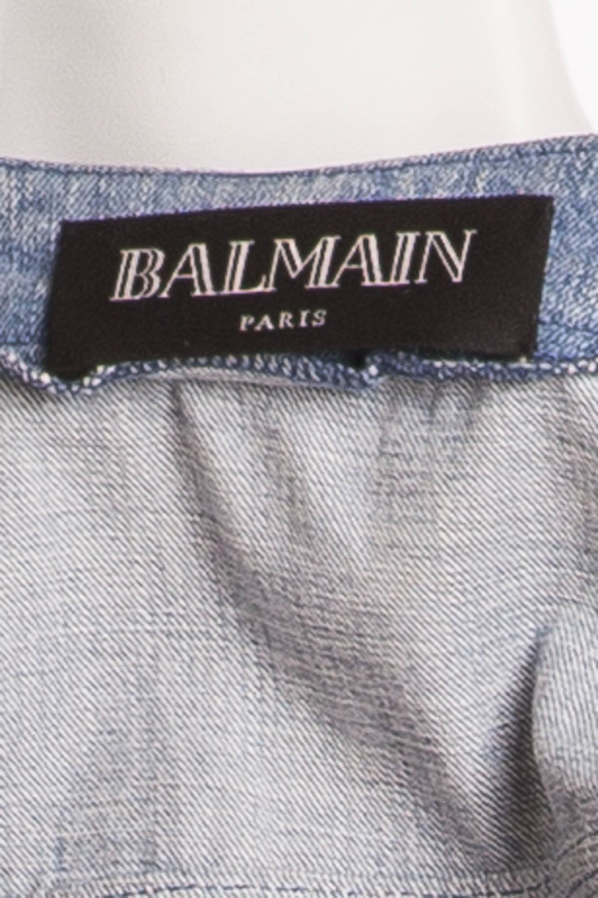 Balmain 2014 Ready to Wear, Denim Quilted Cropped Sleeve Button Up Front Jacket, 3/4 Sleeves, Shoulder Pads, Quilted Paneling, Embossed Buttons, Two Front Flap Pockets and Two Front Faux Flap Pockets Discreet Hook and Eye Fastening.