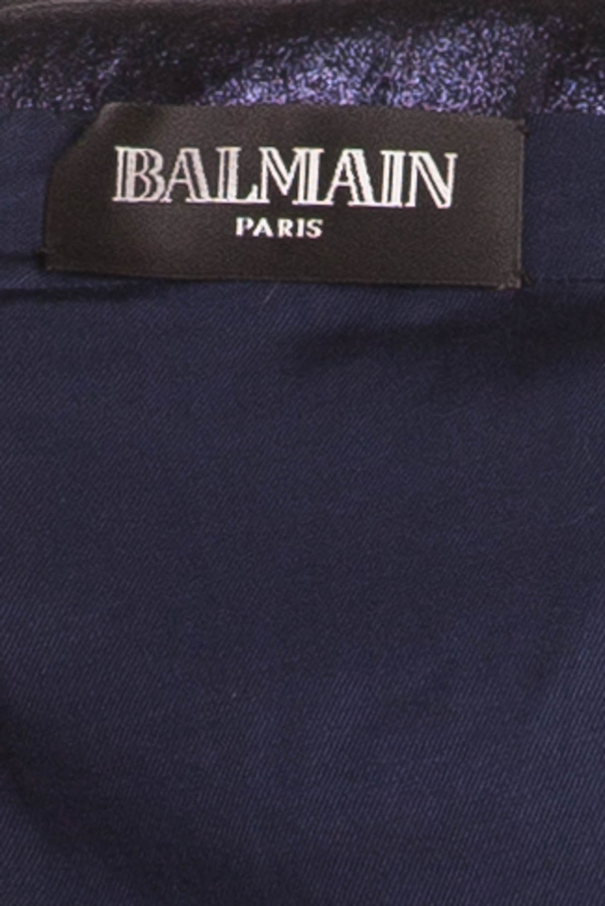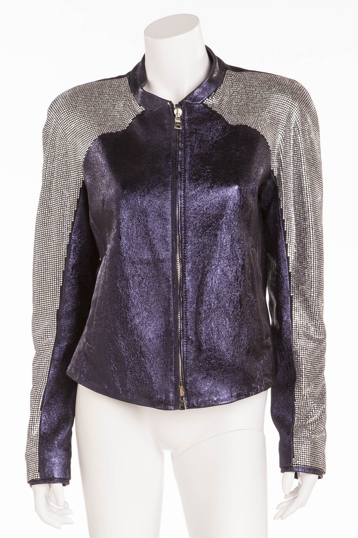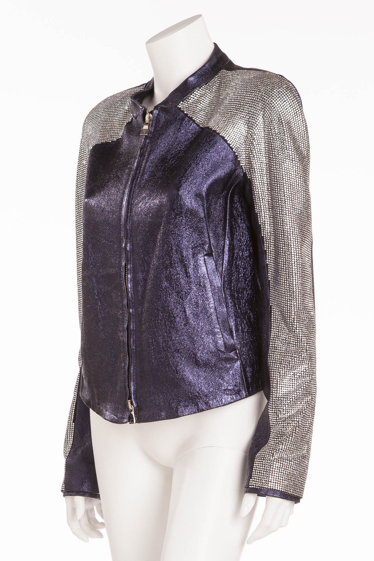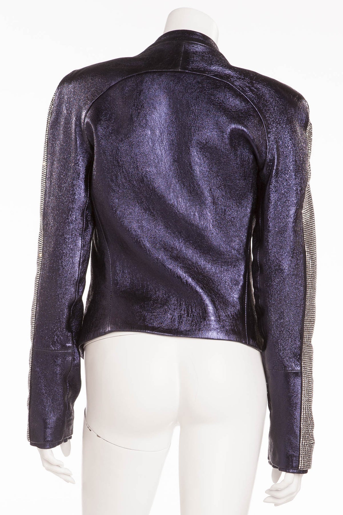 Balmain - Unique New with Tags Navy Blue Pearlescent Leather Jacket w/Rhinestone Arms - FR 40