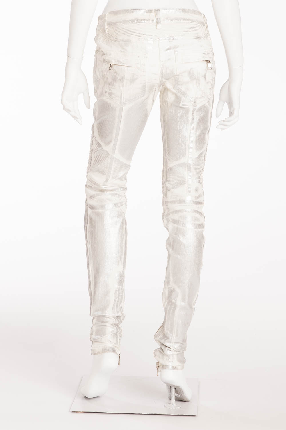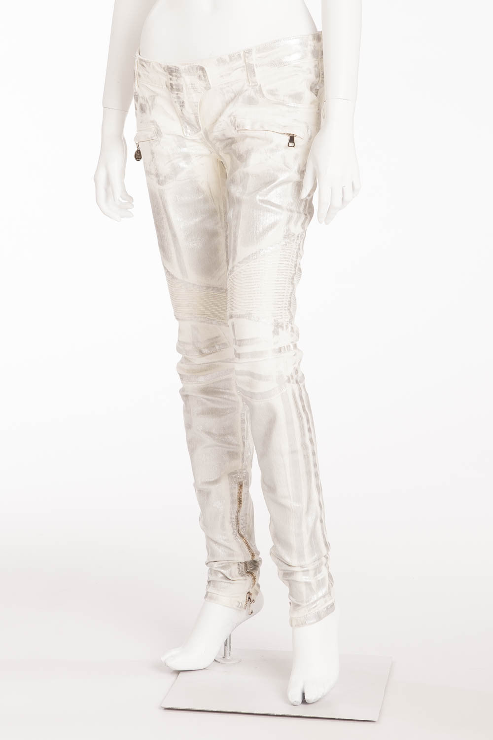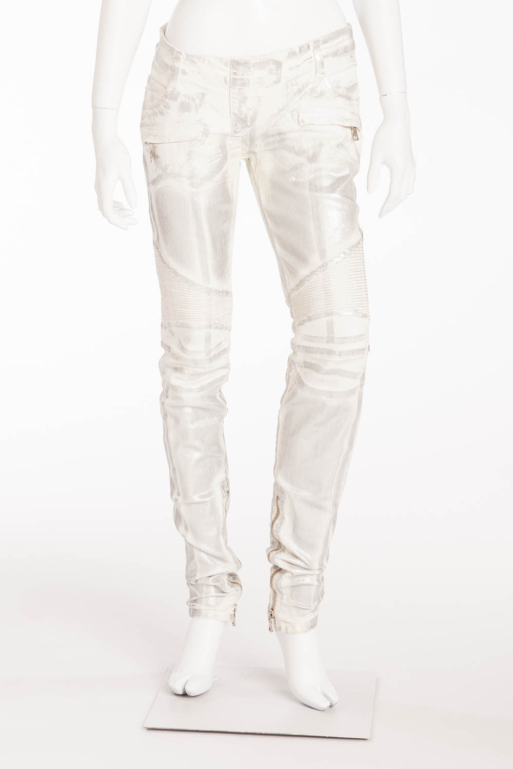 Balmain - Unique White Moto-Style Skinny Jeans with Silver Coating - FR 40