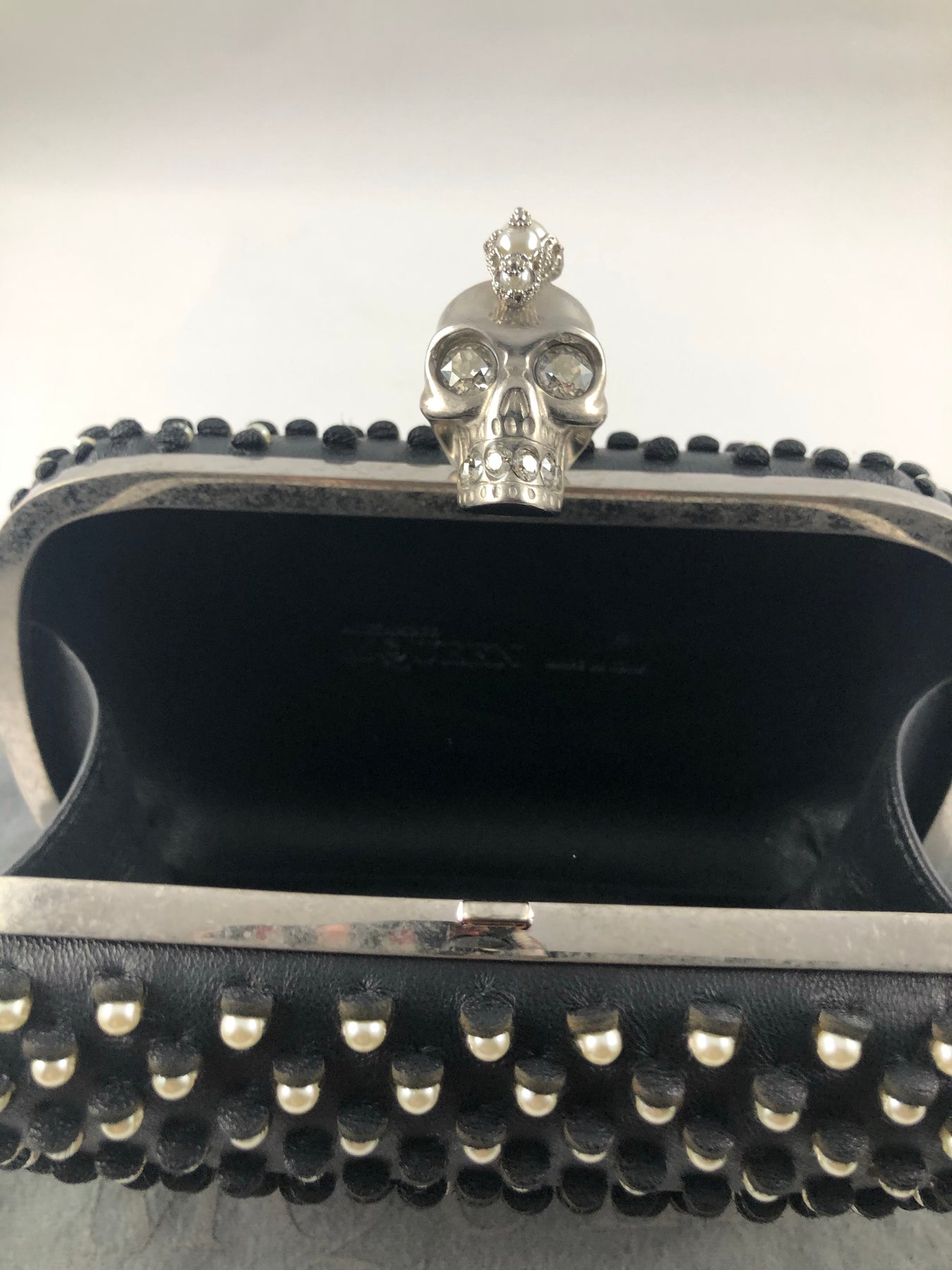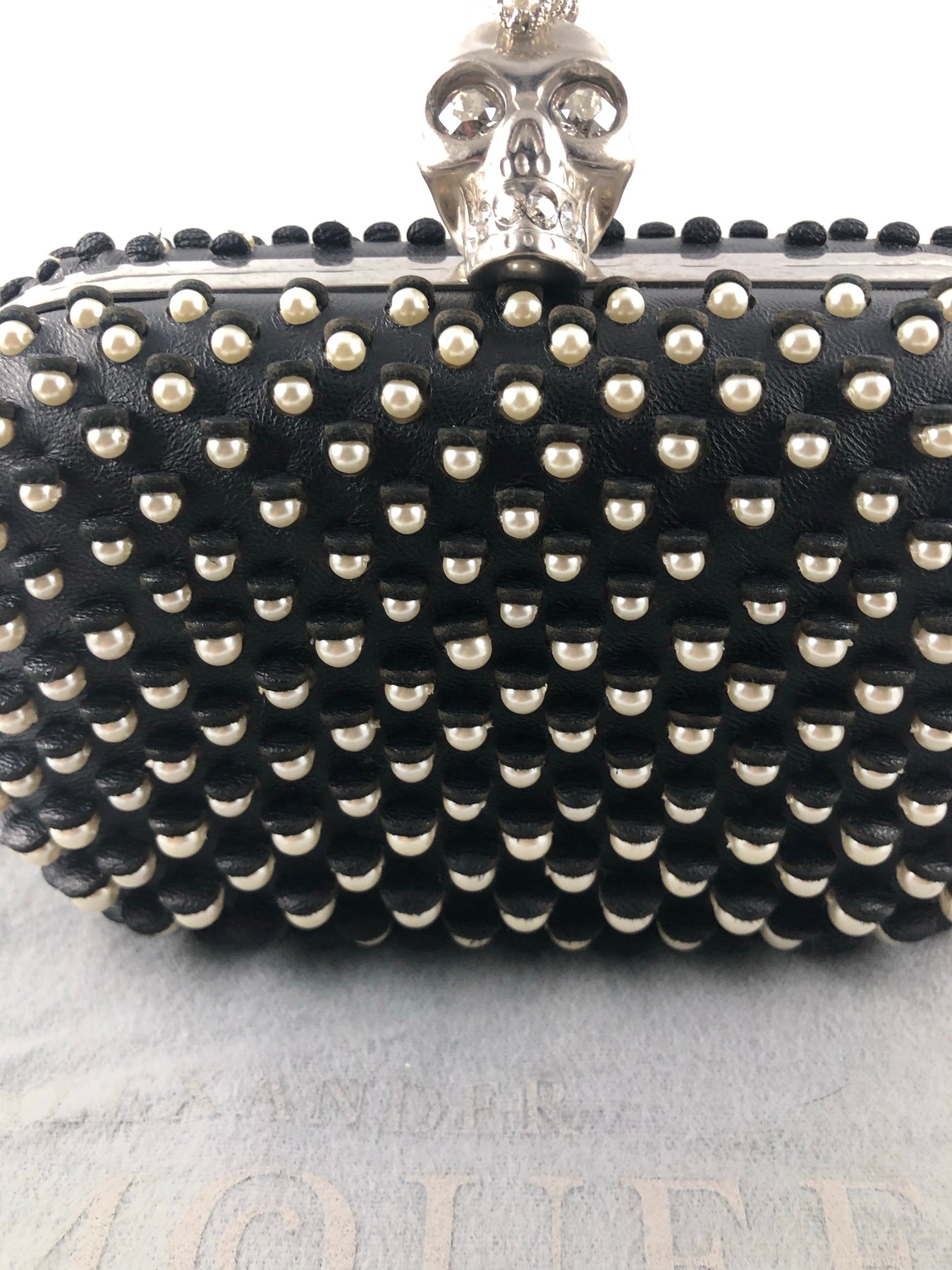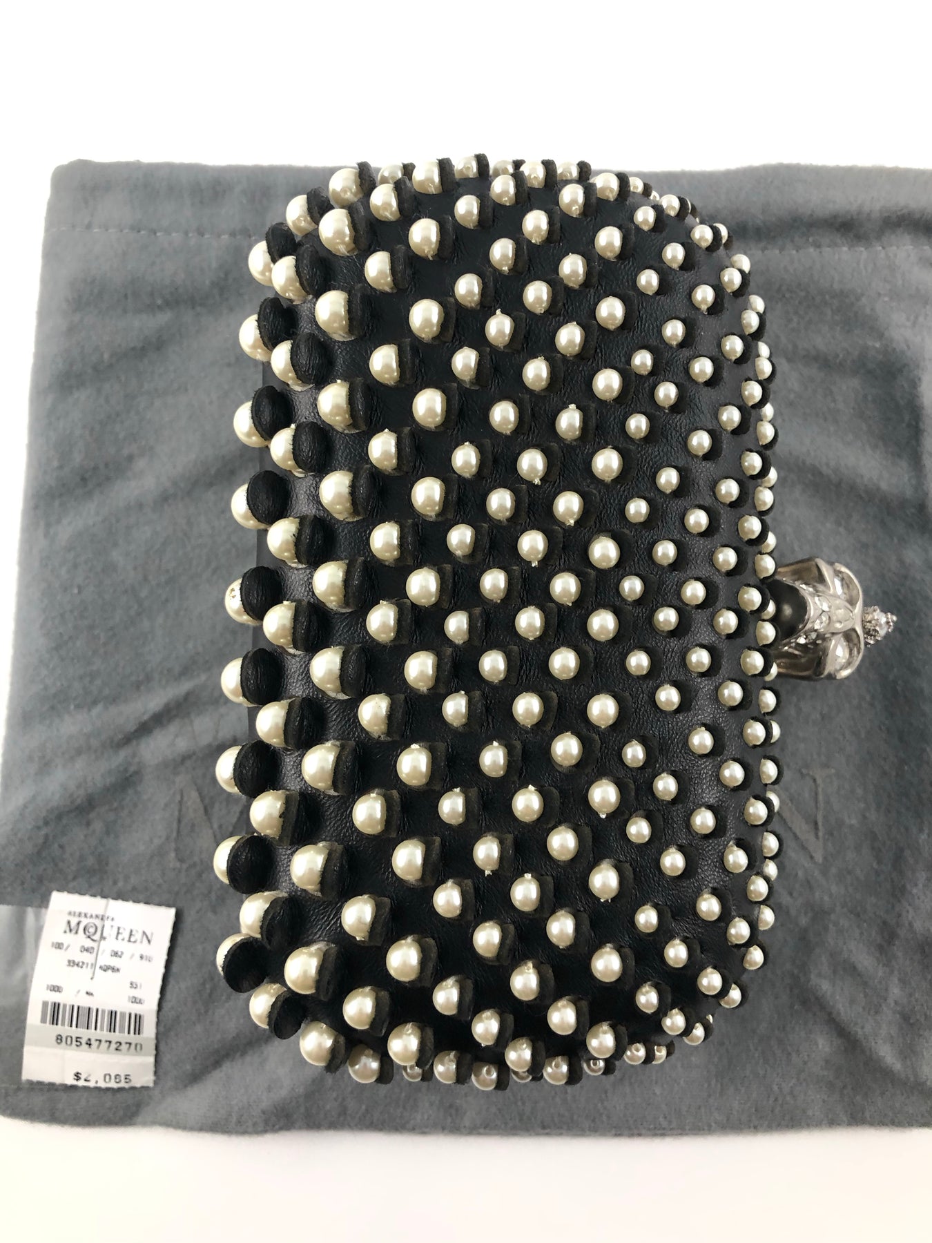 Akexander McQueen black leather clutch features a signature skull clasp , a silver tone hardware and an internal logo stamp, embellished with graduated in sizes white pearls