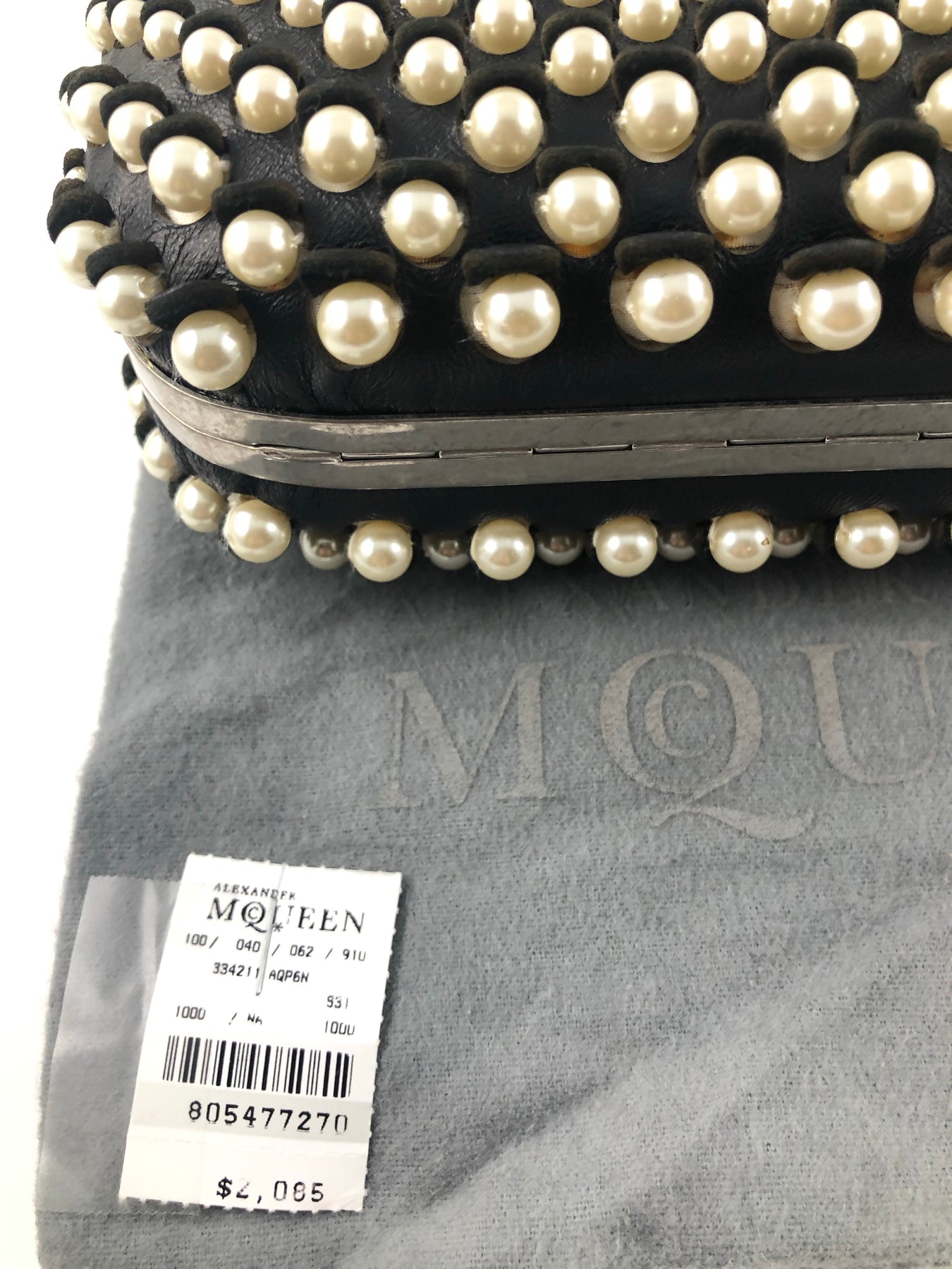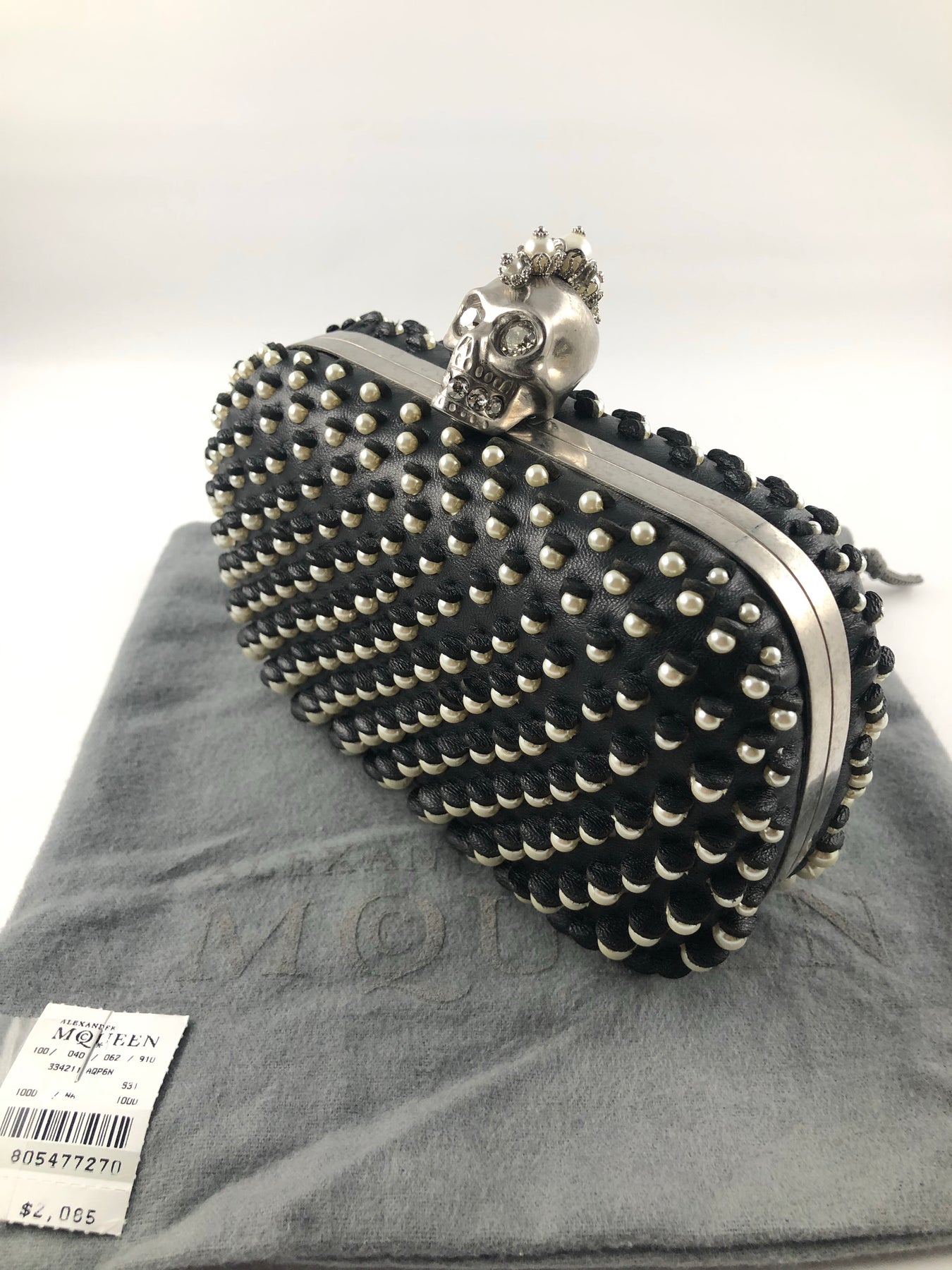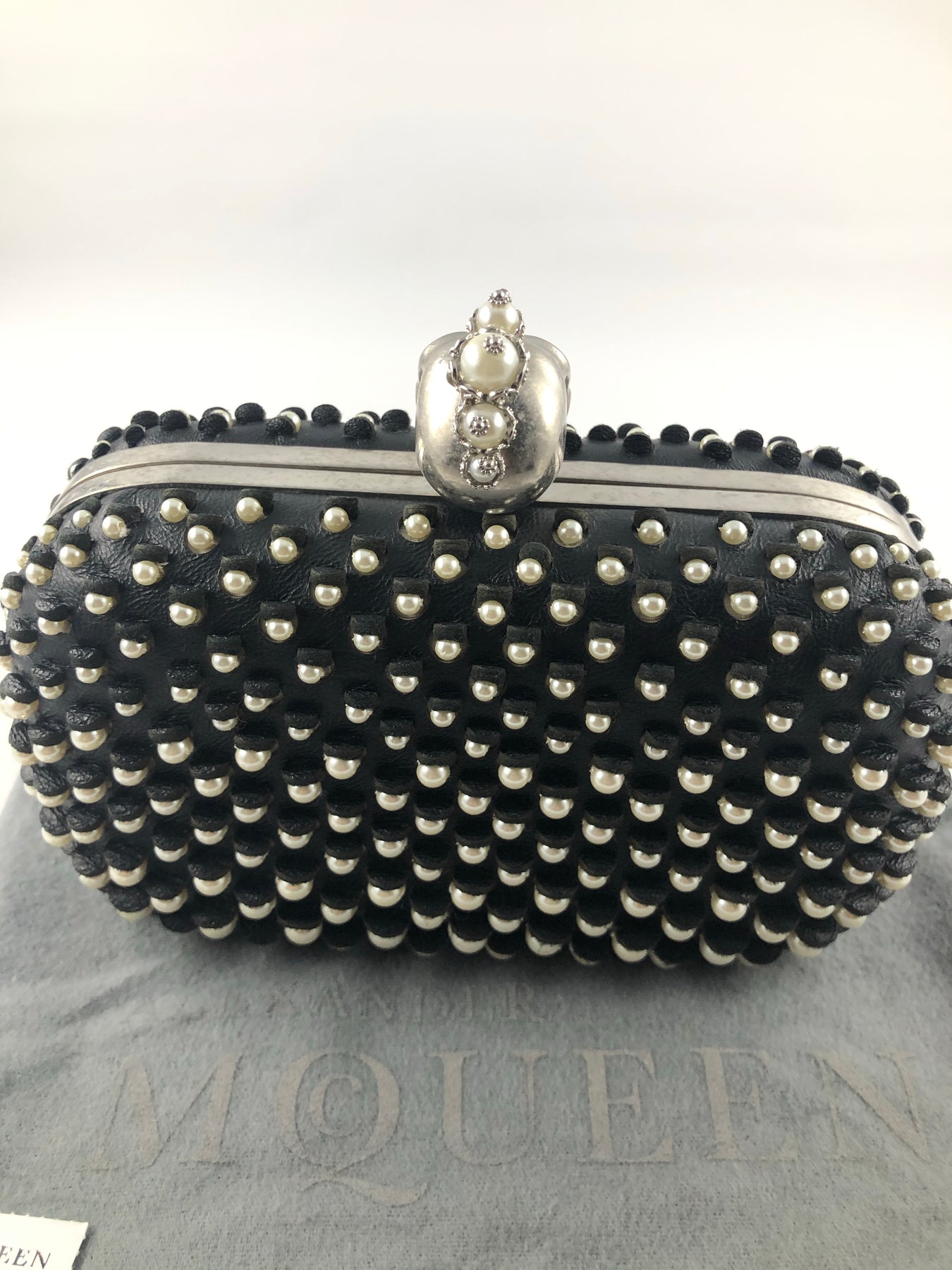 Akexander McQueen black leather clutch features a signature skull clasp , a silver tone hardware and an internal logo stamp, embellished with graduated in sizes white pearls