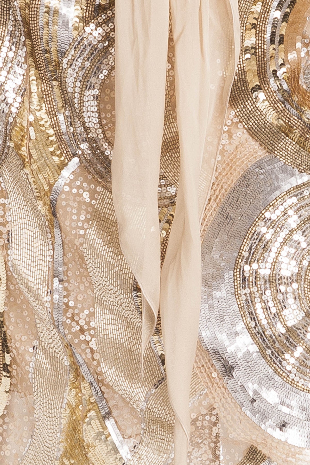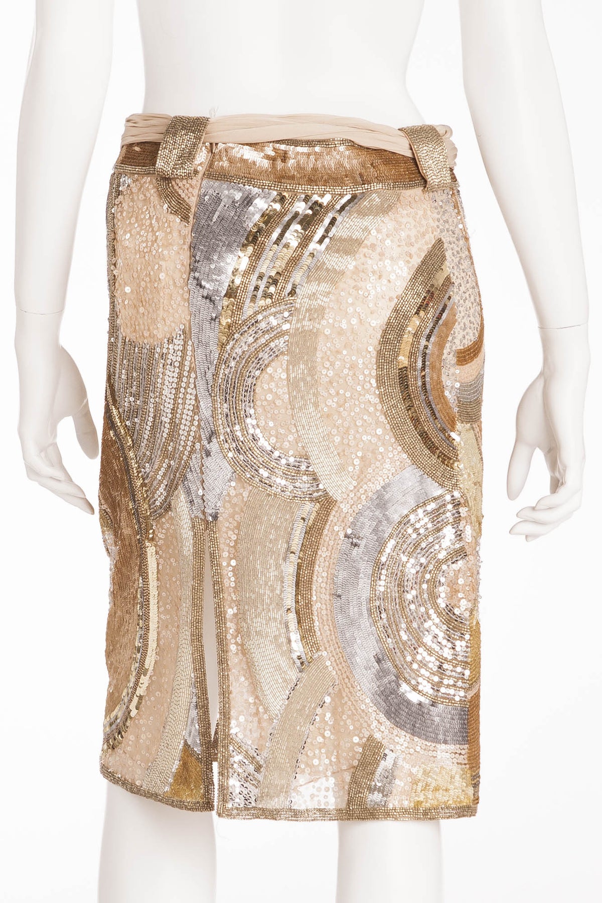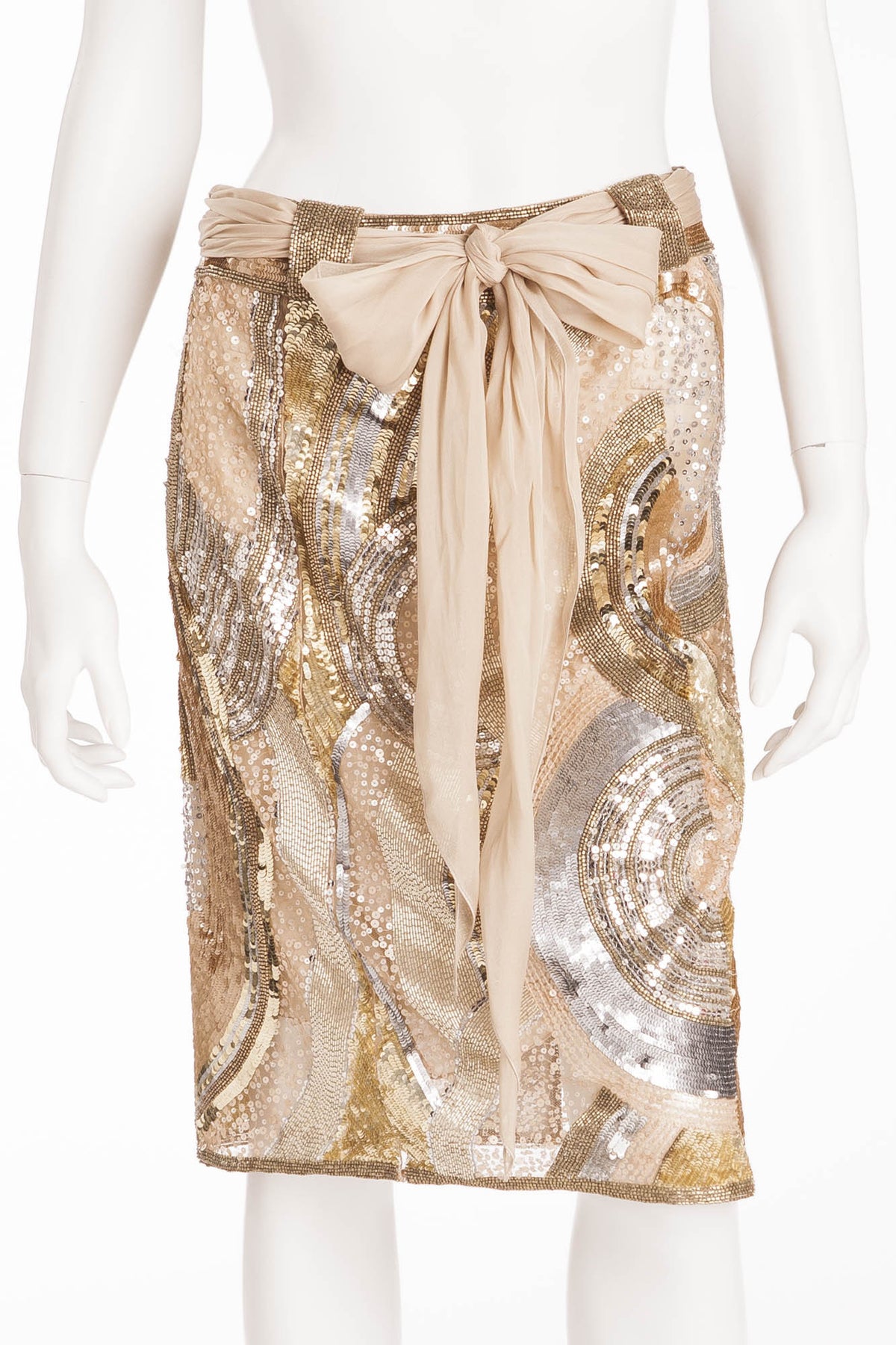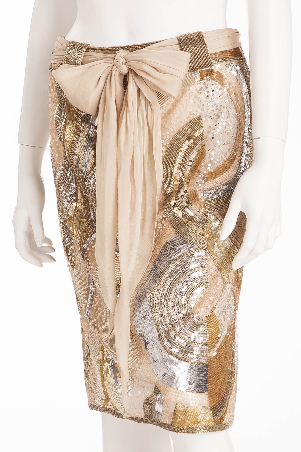 Valentino - IT 40 ,New Cream, Gold and Silver Sequin Pencil Skirt with Chiffon Belt -